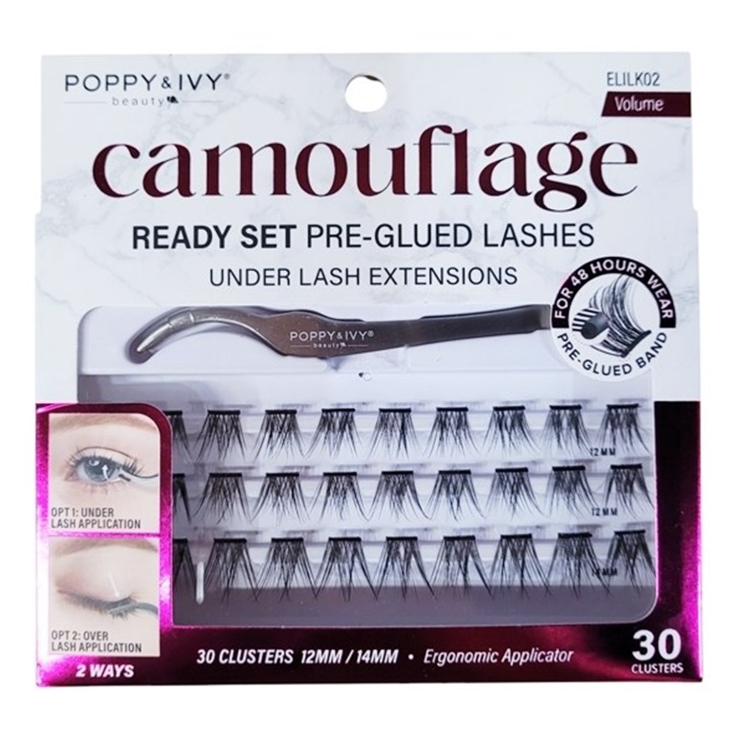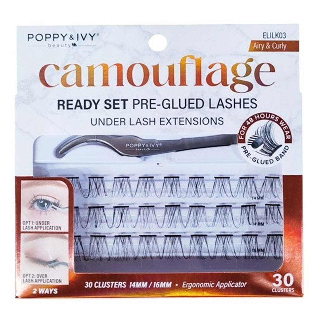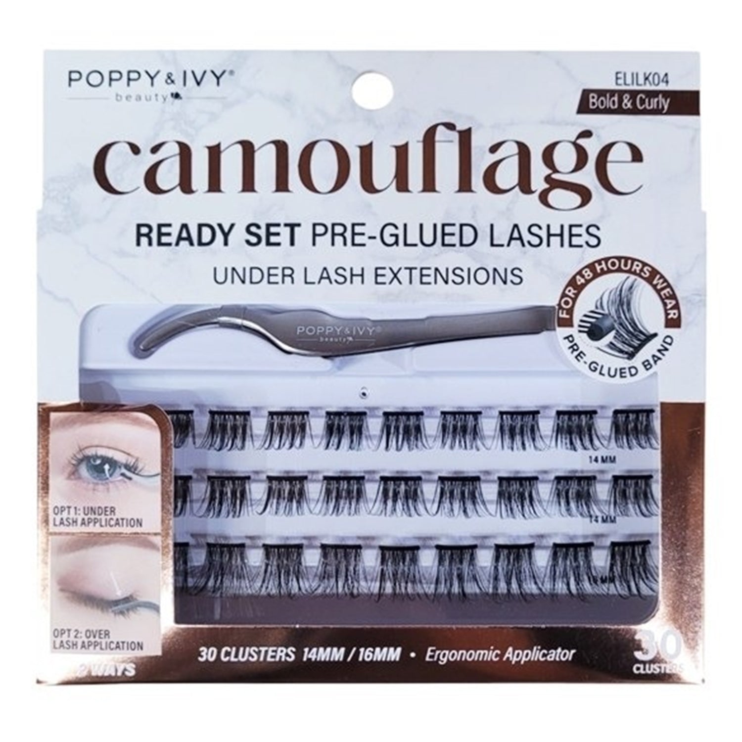 Enhance lashes with Camouflage Ready Set Pre-Glued Lash Kits. Created with Advanced Bond Technology to help clusters stay in place for 48 hours in one easy application.