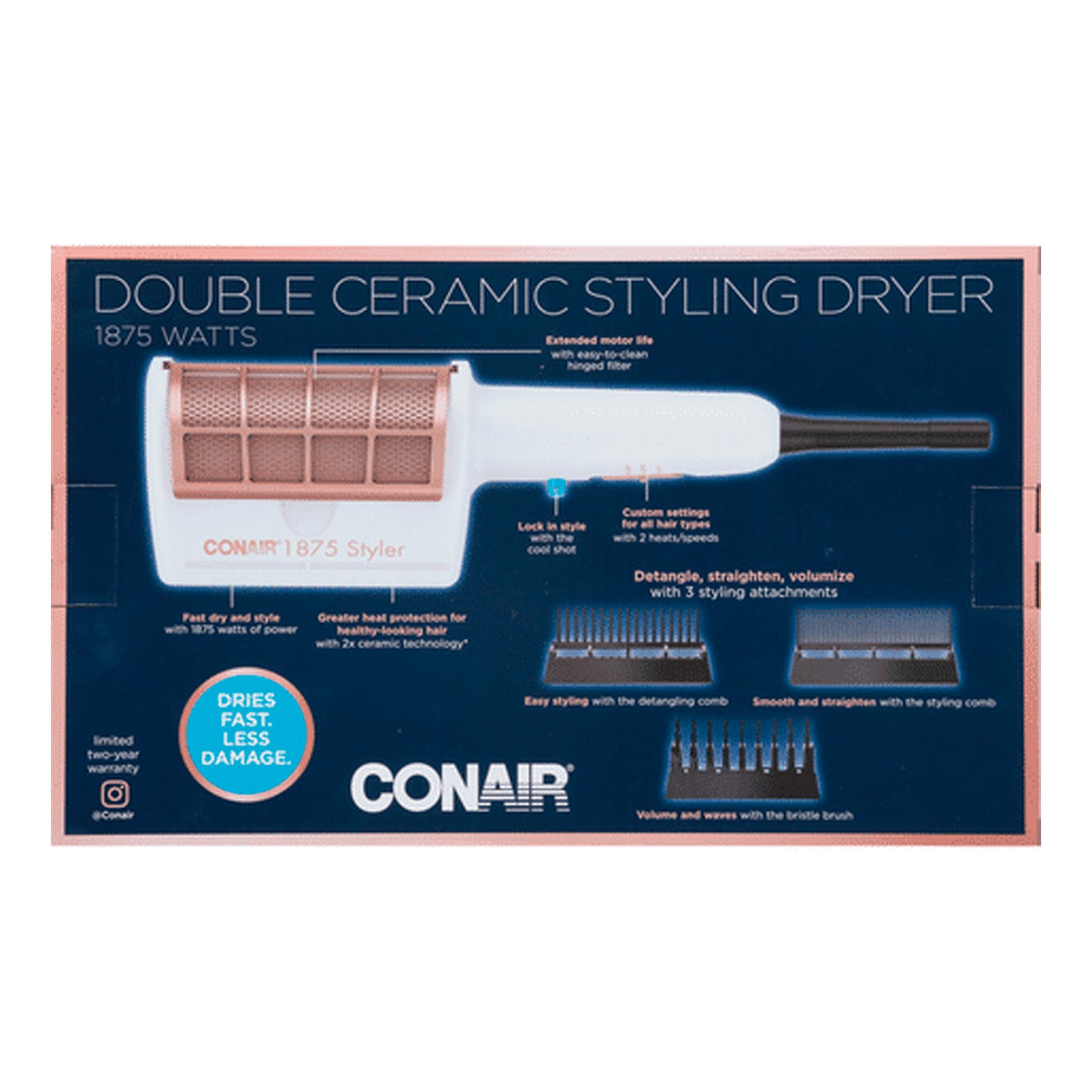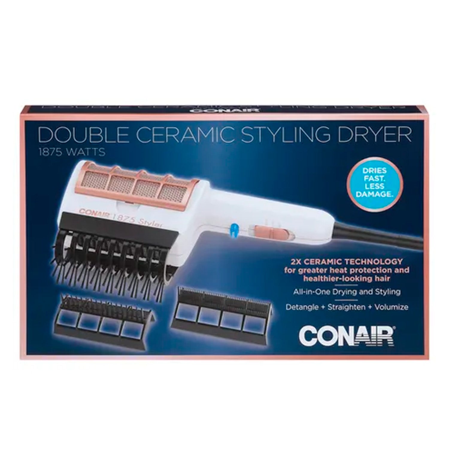 Experience smoother, shinier, and healthier-looking hair with the Conair Double Ceramic Styling Dryer. Designed with double-layered ceramic technology, this dryer delivers gentle, even infrared heat to reduce damage and minimize hot spots, making it ideal for everyday styling. Its powerful airflow ensures fast drying, while multiple heat and speed settings allow you to customize your experience for any hair type or texture.