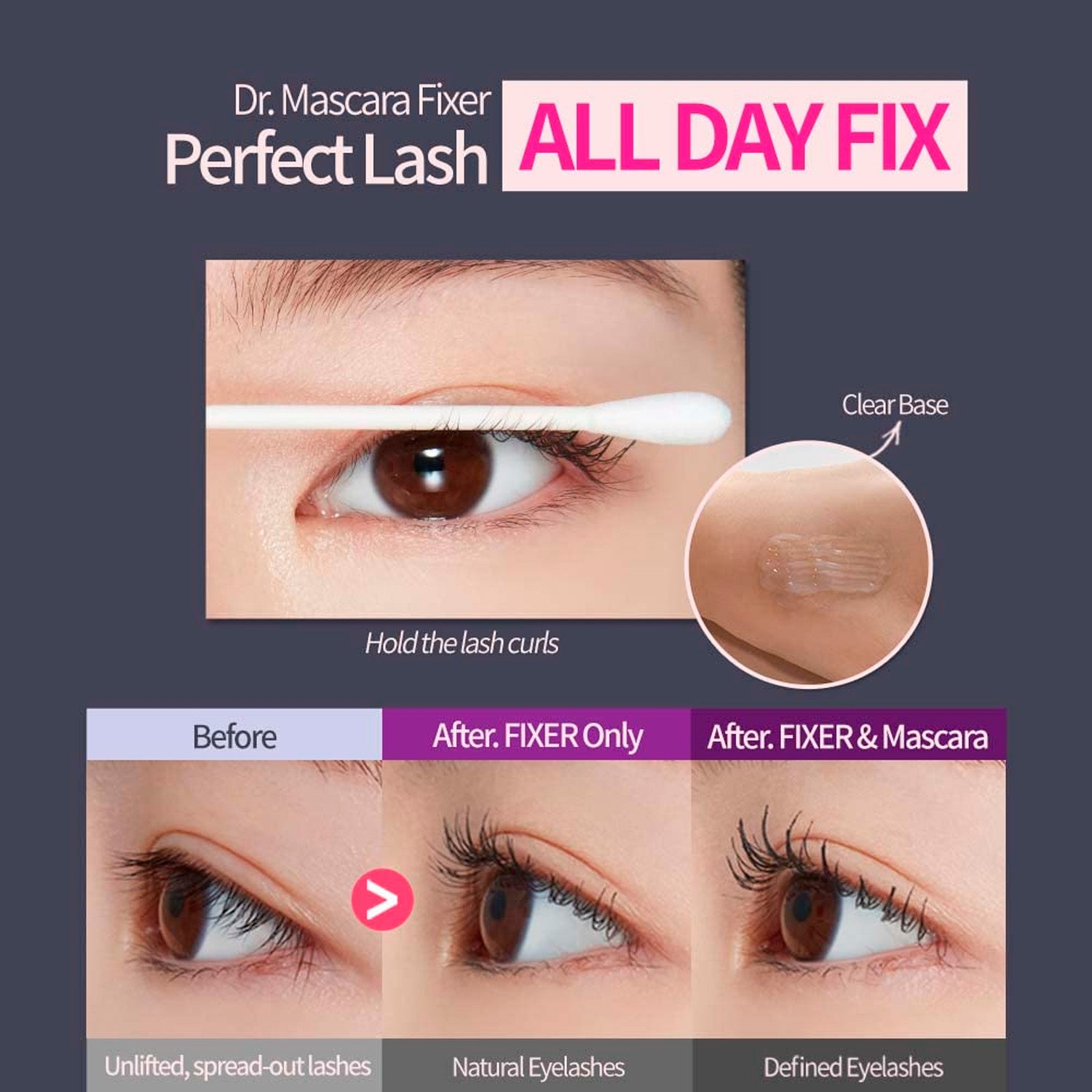 Achieve flawless, long-lasting lashes with Etude Dr. Mascara Fixer. This transparent lash primer boosts volume, curl, and wear time for any mascara. Its lightweight gel formula coats each lash to hold curls in place and prevent smudging or drooping throughout the day. Use it before mascara for enhanced hold or after for a waterproof sealing effect. Perfect for keeping your lashes lifted, defined, and smudge-free all day long.