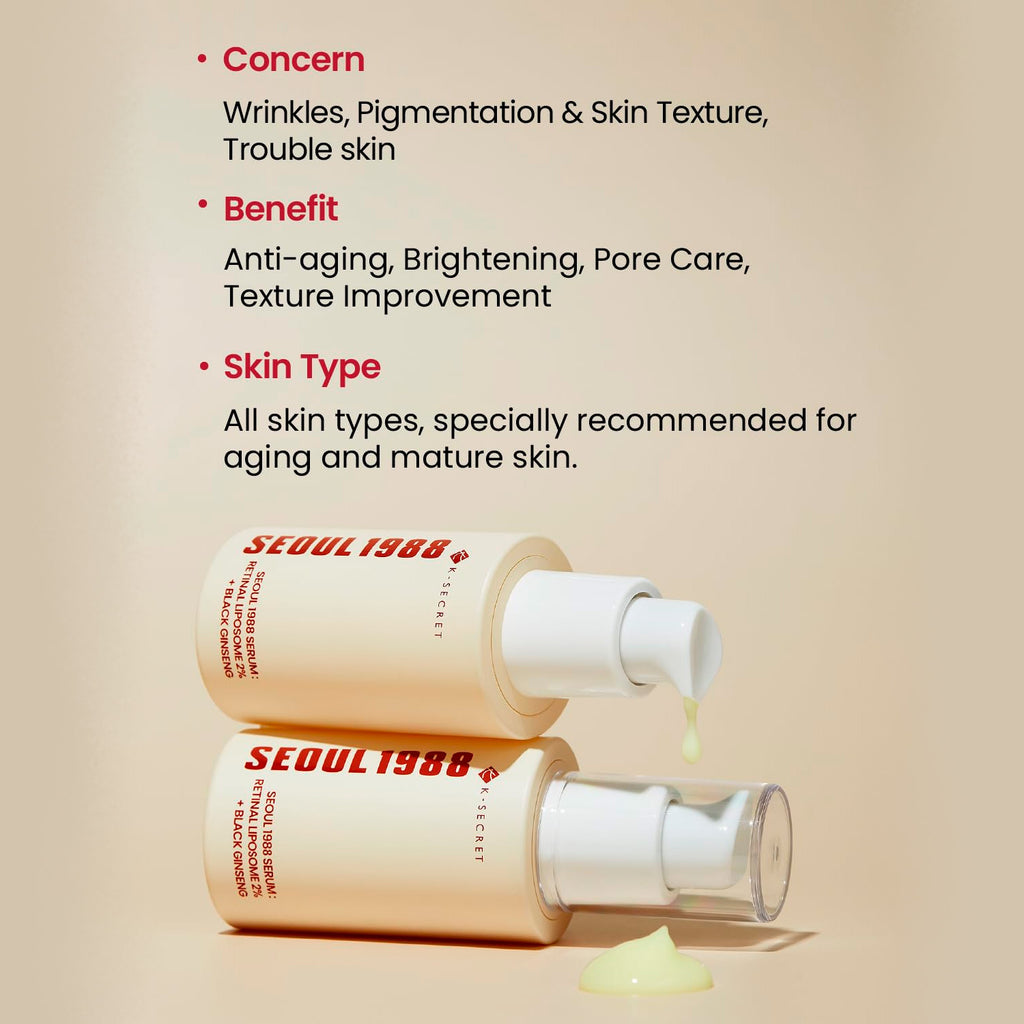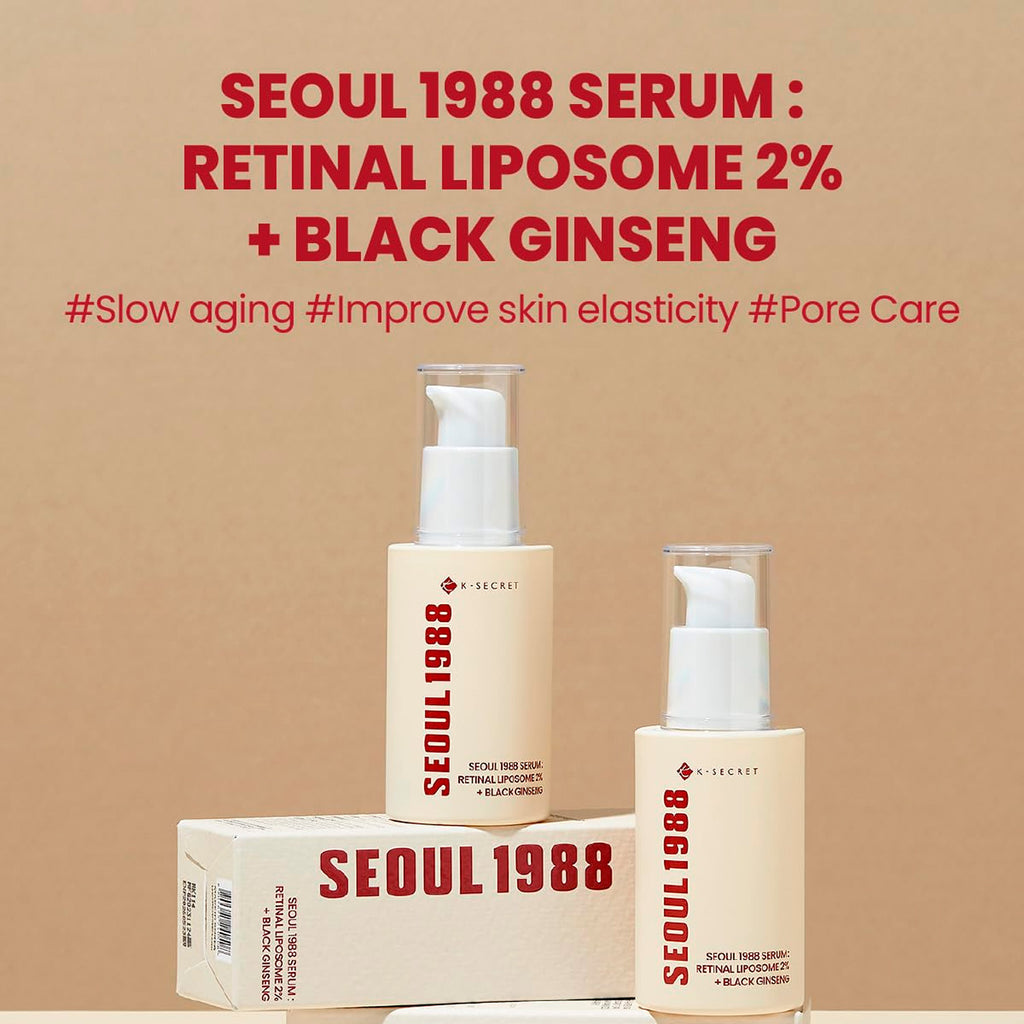 Elevate your skincare routine with the Ksecret Seoul 1988 Serum – a powerful anti-aging formula that combines advanced science with traditional Korean herbal medicine. Featuring 2% Retinal encapsulated in liposomes, this serum delivers potent results with minimal irritation, helping to accelerate cell turnover, smooth fine lines, and improve skin texture.