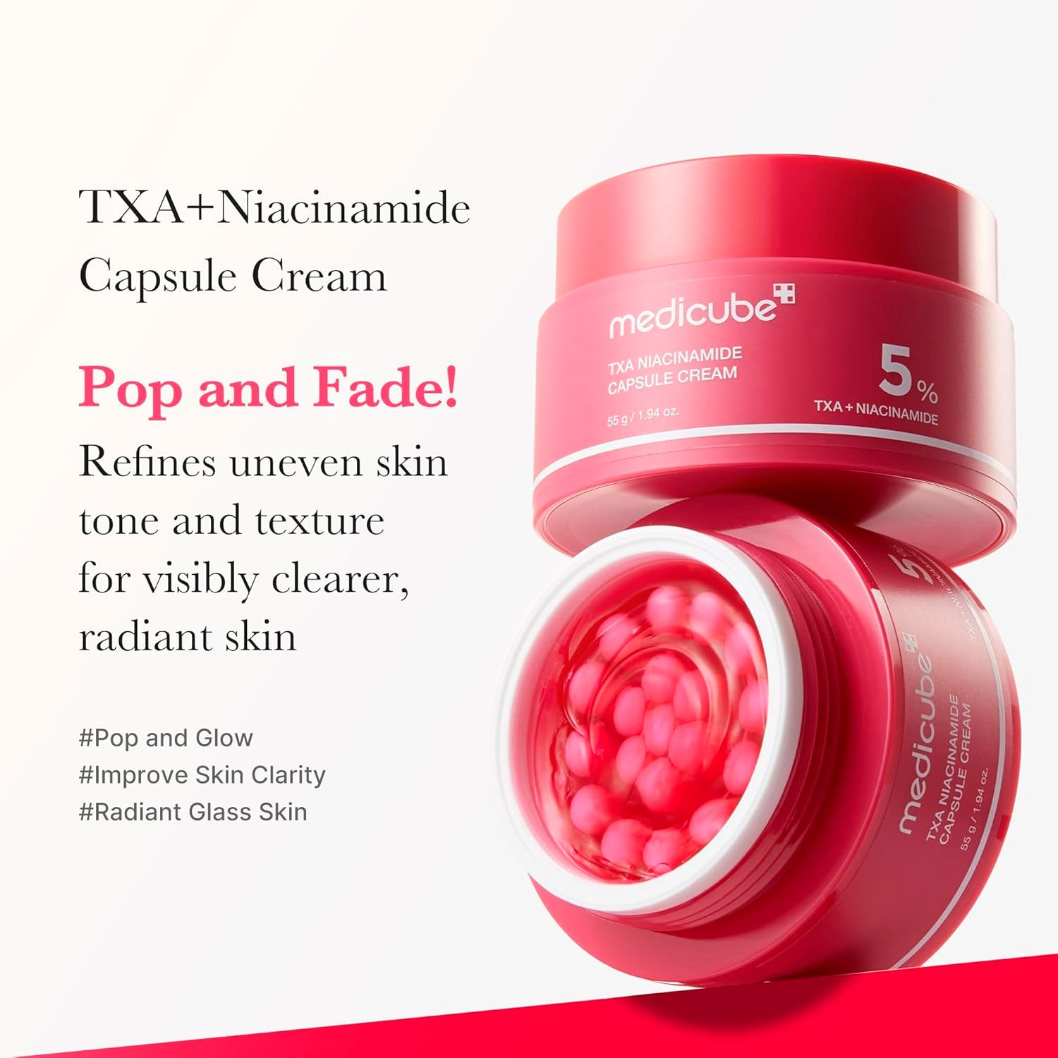 Elevate your skincare routine with Medicube TXA+Niacinamide Capsule Cream, a powerful brightening cream formulated to target dark spots, uneven skin tone, and dullness. This advanced cream combines two of the most effective brightening ingredients — Tranexamic Acid (TXA) and Niacinamide — to deliver visible improvements in skin clarity and radiance.