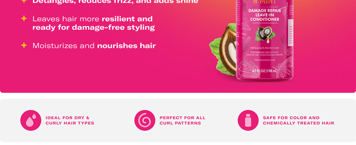Mielle Babassu & Mint Damage Repair Leave-In Conditioner is a must-have for anyone looking to transform their damaged hair. When used as part of the Babassu & Mint collection, this product is proven to show noticeable results after just one use. This intense reparative leave-in conditioner provides continuous spray application for easy use. It detangles, reduces frizz, and adds shine, leaving your hair healthier, more resilient, and ready for damage-free styling.