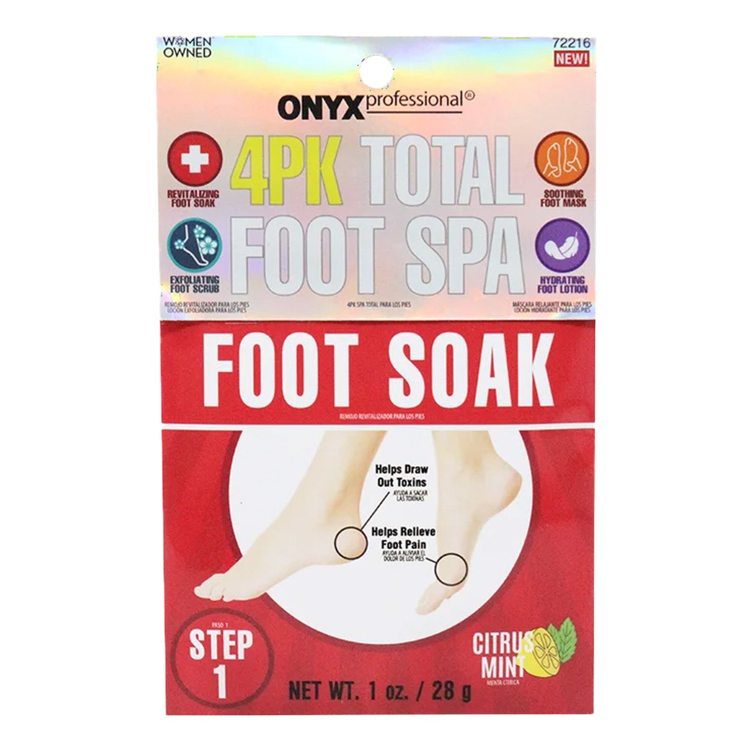 Indulge in a premium at-home pedicure experience with the Onyx Professional Total Foot Spa 4‑pack. This all‑in‑one treatment kit combines four essential foot care steps—soak, scrub, mask, and lotion—each in convenient individual packets. Formulated with refreshing citrus-mint scent and powerful moisturizing ingredients like avocado oil, Vitamin E, and menthol, it effectively cleanses, exfoliates, nourishes, and softens tired, dry feet. Ideal for all skin types, this kit offers a spa-quality treatment that helps soothe stress after a long day, leaving your feet feeling revitalized and silky smooth.