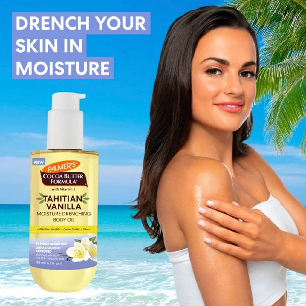 Drench skin in luxuriously comforting hydration with Palmer's Cocoa Butter Formula Tahitian Vanilla Body Oil, crafted with soothing and protecting Shea, Sweet Almond Oil and rich Tahitian Vanilla for soft, silky skin.