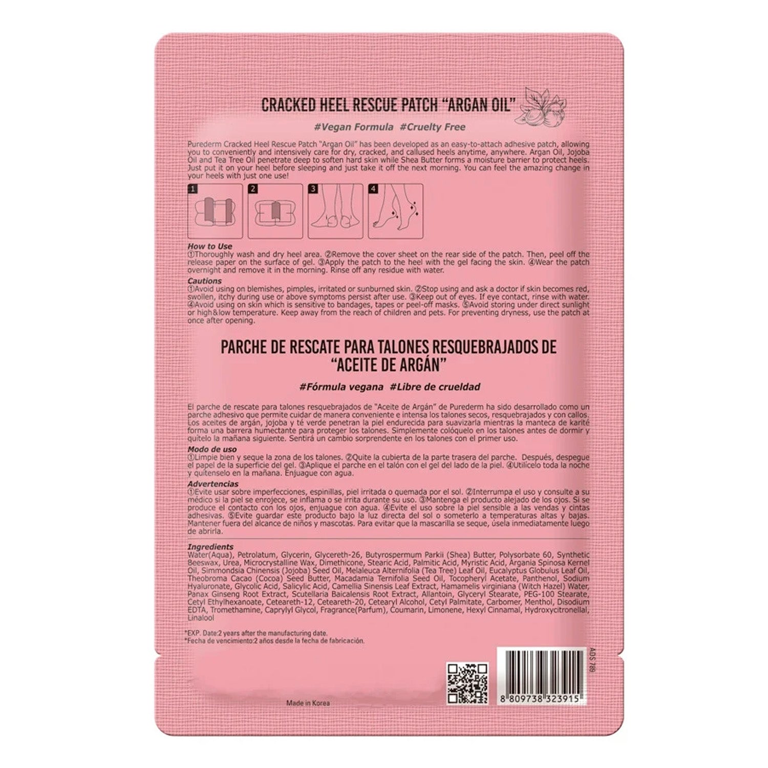 Purederm Cracked Heel Rescue Patch “Argan Oil” has been developed as an easy-to-attach adhesive patch, allowing you to conveniently and intensively care for dry, cracked, and callused heels anytime, anywhere. Argan Oil, Jojoba Oil and Tea Tree Oil penetrate deep to soften hard skin while Shea Butter forms a moisture barrier to protect heels. Just put it on your heel before sleeping and just take it off the next morning. You can feel the amazing change in your heels with just one use!