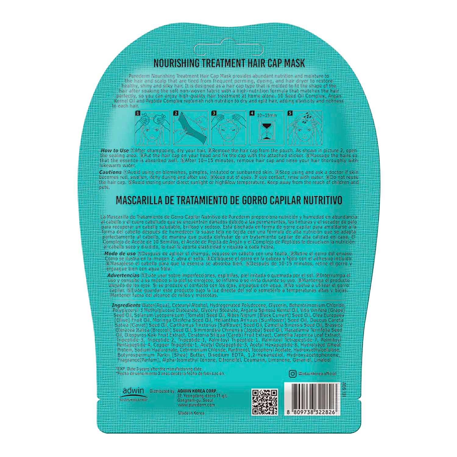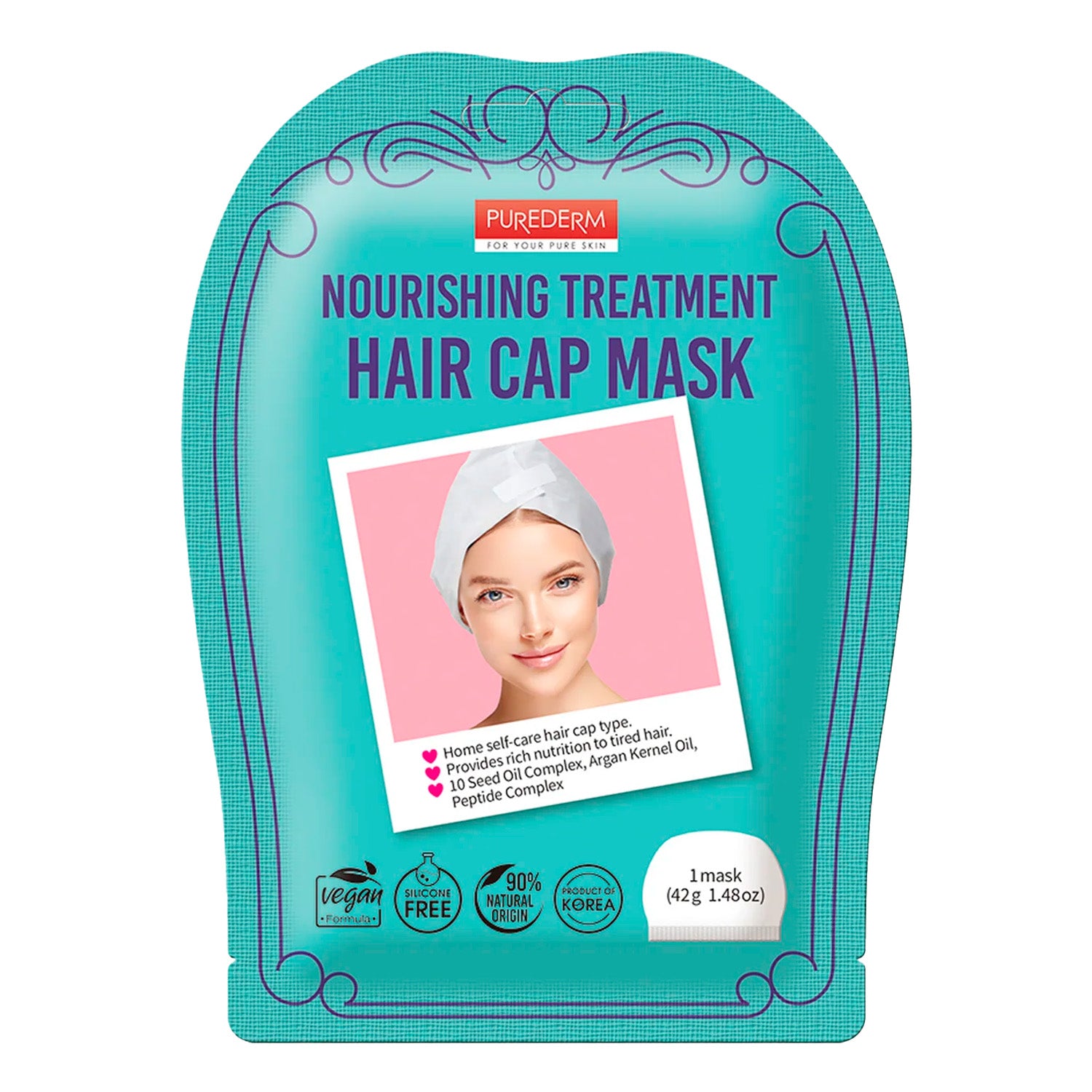 The PUREDERM Nourishing Treatment Hair Cap Mask (42g) is a single-use, salon-quality hair treatment designed to deeply nourish and hydrate dry, damaged, or chemically treated hair. Enriched with a blend of natural oils—including Argan Kernel Oil and a 10 Seed Oil Complex—this mask replenishes moisture, enhances elasticity, and restores shine to the hair and scalp. Its advanced formula also incorporates a Peptide Complex to further hydrate and strengthen hair fibers.