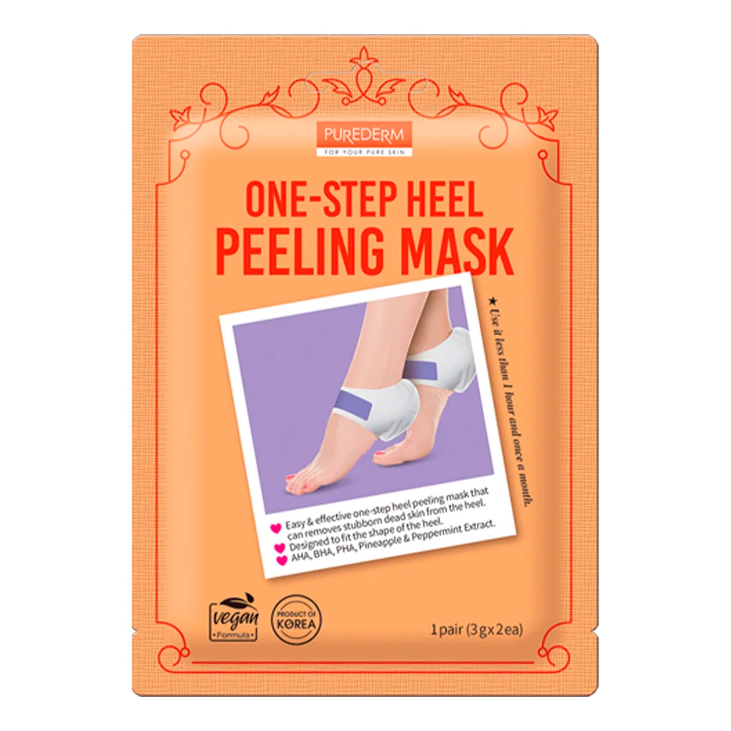 Purederm One-step Heel Peeling Mask is an easy one-step heel mask that perfectly removes stubborn dead skin and calluses from the heel. Since the soft fabric and waterproof material are laminated in one piece, you can easily exfoliate the heel by wearing it only once. In addition, it is designed in an optimal shape that fits the heel, so there is no inconvenience in daily life while wearing the mask. AHA, BHA and PHA removes stubborn calluses, Pineapple & Peppermint calms  freshly exfoliated skin.