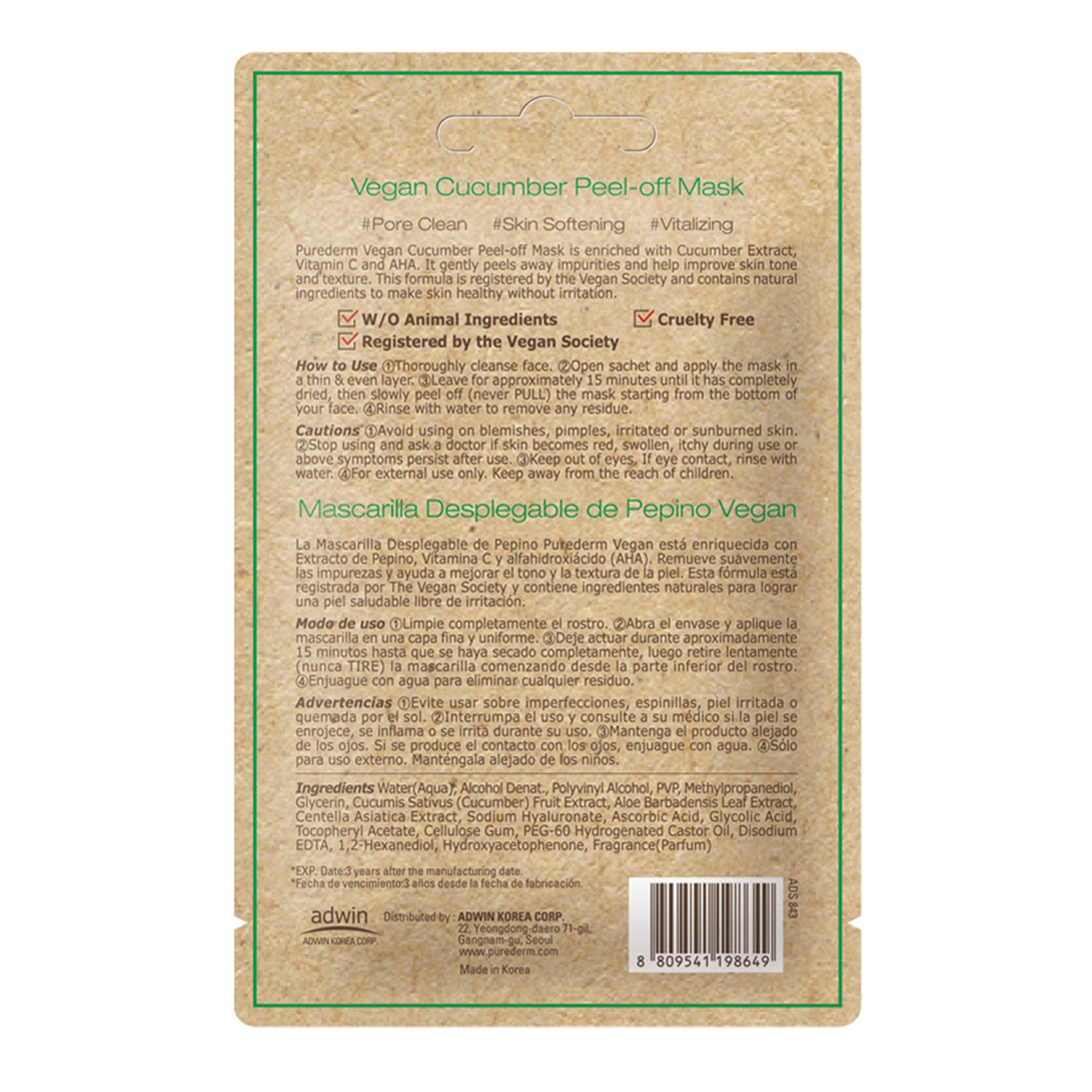Purederm Vegan Cucumber Peel-off Mask is enriched with Cucumber Extract, Vitamin C and AHA. It gently peels away impurities and helps improve skin tone and texture. This formula is registered by the Vegan Society and contains natural ingredients to make skin healthy without irritation.