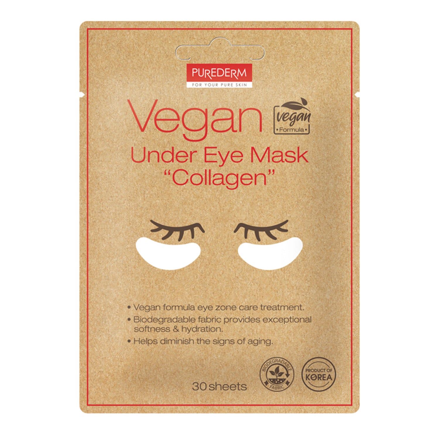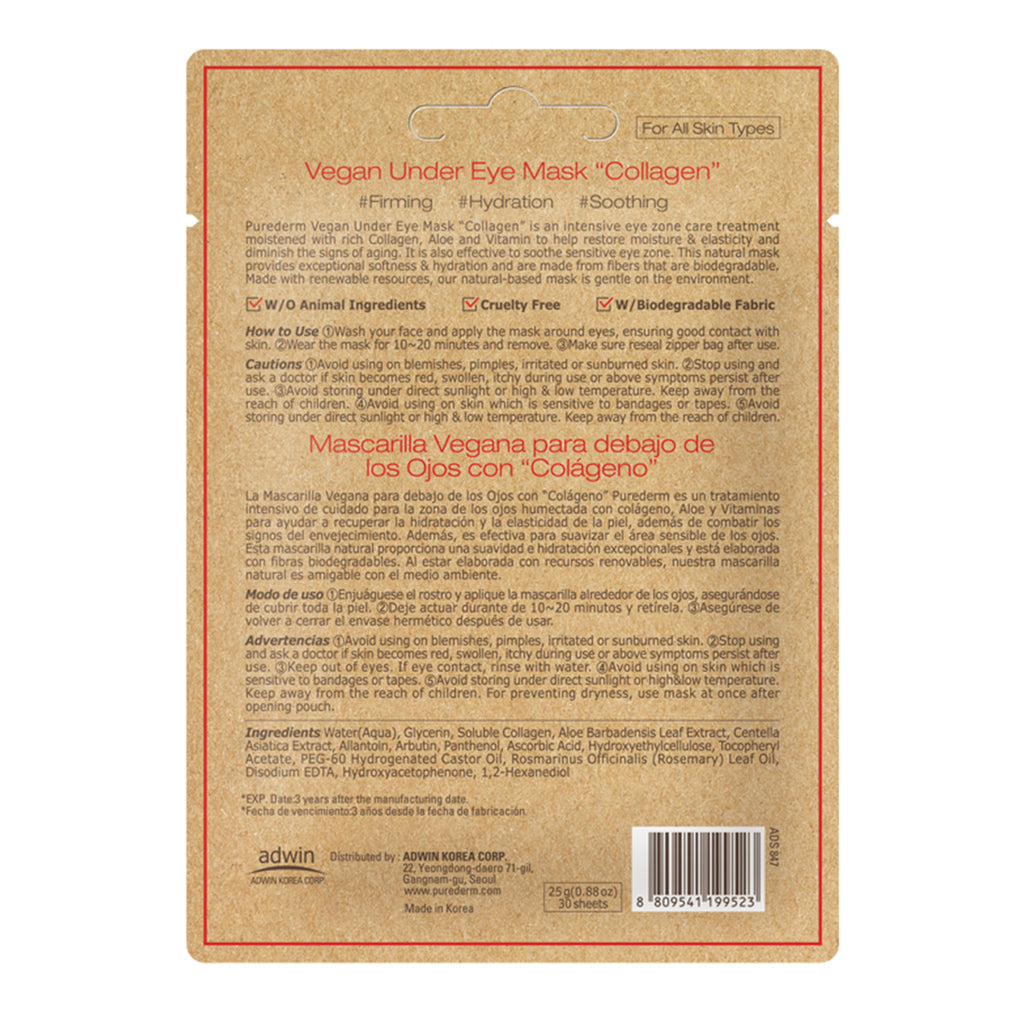Purederm Vegan Under Eye Mask "Collagen" is an intensive eye zone care treatment moistened with rich Collagen, Aloe and Vitamin to help restore moisture & elasticity and diminish the signs of aging. It is also effective to soothe sensitive eye zone. This natural mask provides exceptional softness & hydration and are made from fibers that are biodegradable. Made with renewable resources, our natural-based mask is gentle on the environment.