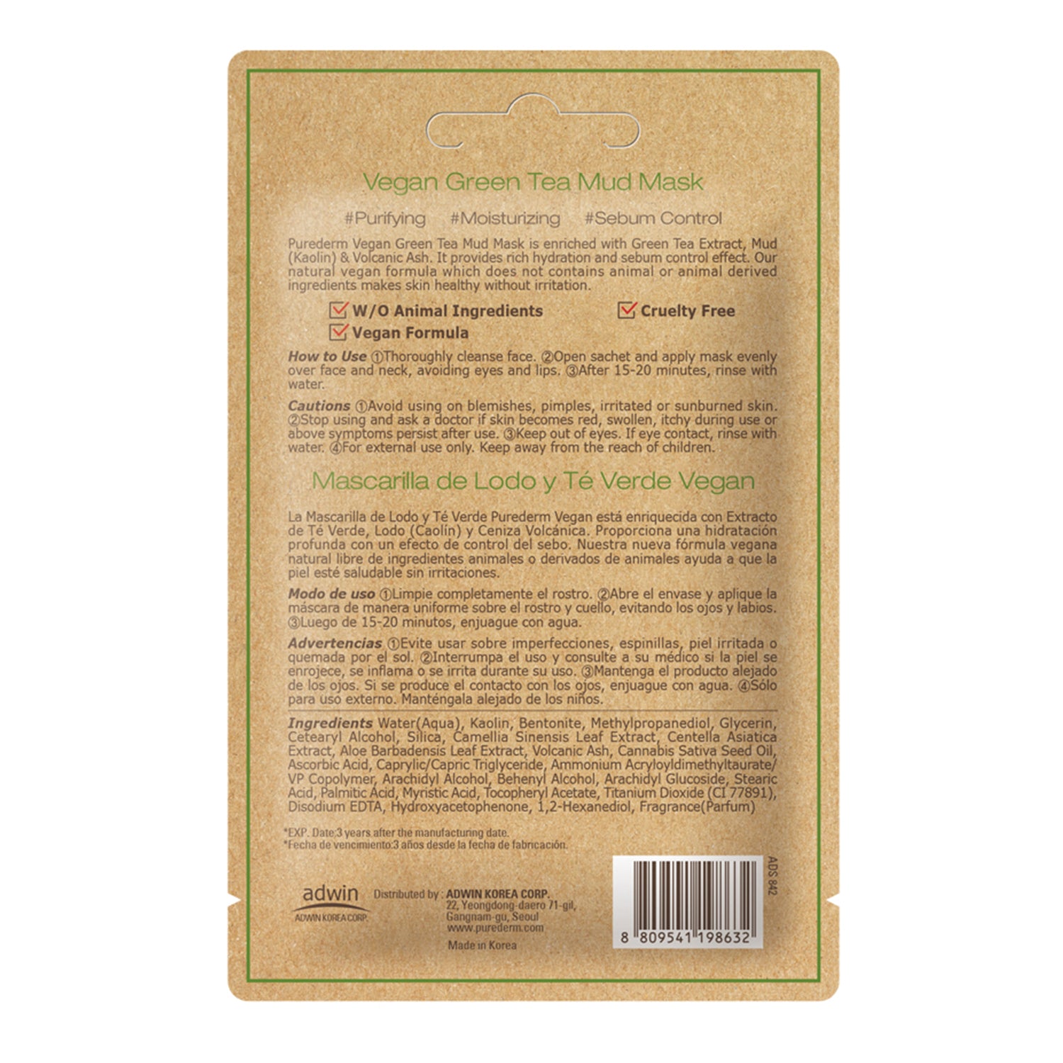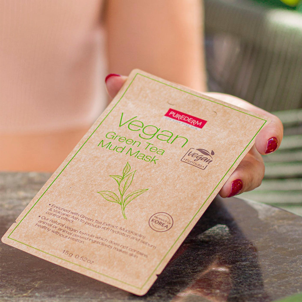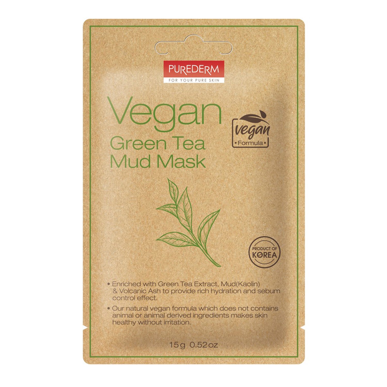 Purederm Vegan Green Tea Mud Mask is enriched with Green Tea Extract, Mud(Kaolin) & Volcanic Ash. It provides rich hydration and sebum control effect. This formula is registered by the Vegan Society and contains natural ingredients to make skin healthy without irritation.