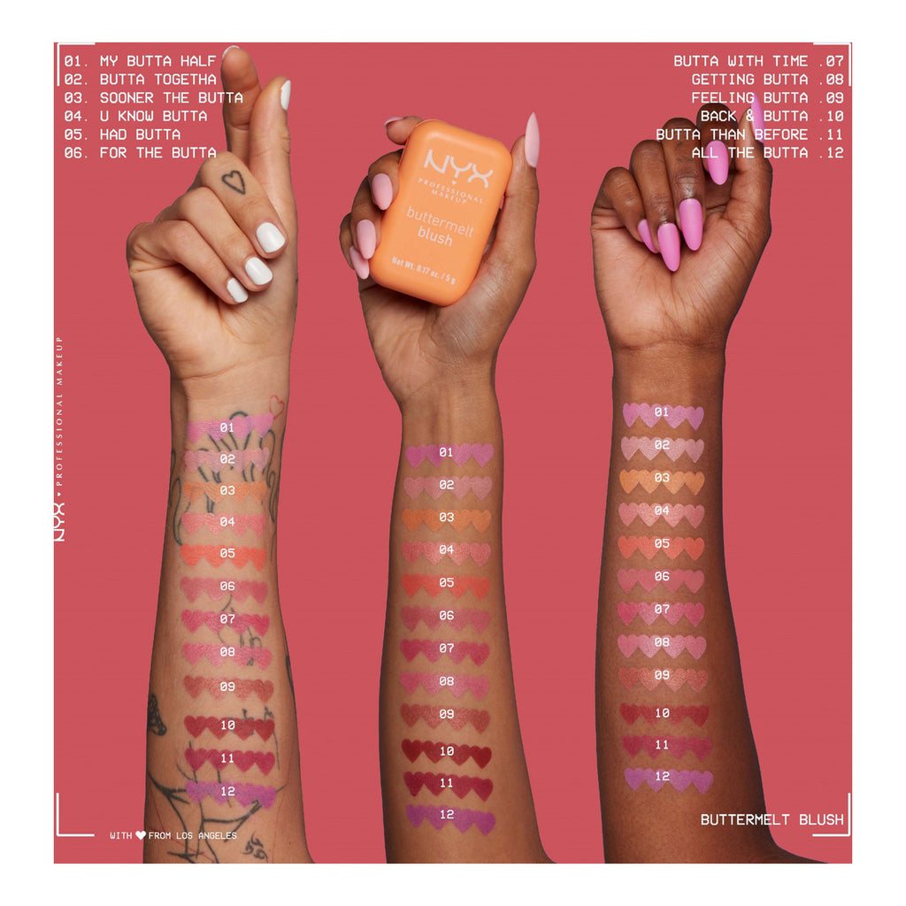 The NYX Professional Buttermelt Blush is a smooth, velvety blush that melts into your skin for a natural, radiant flush of color. Its creamy texture ensures effortless blending, providing a soft, airbrushed finish. This lightweight, buildable formula allows you to customize your desired intensity, whether you prefer a subtle hint of color or a more vibrant look. In a convenient compact size of 0.17oz/5g, it’s perfect for on-the-go application, adding a healthy, glowing warmth to your complexion.