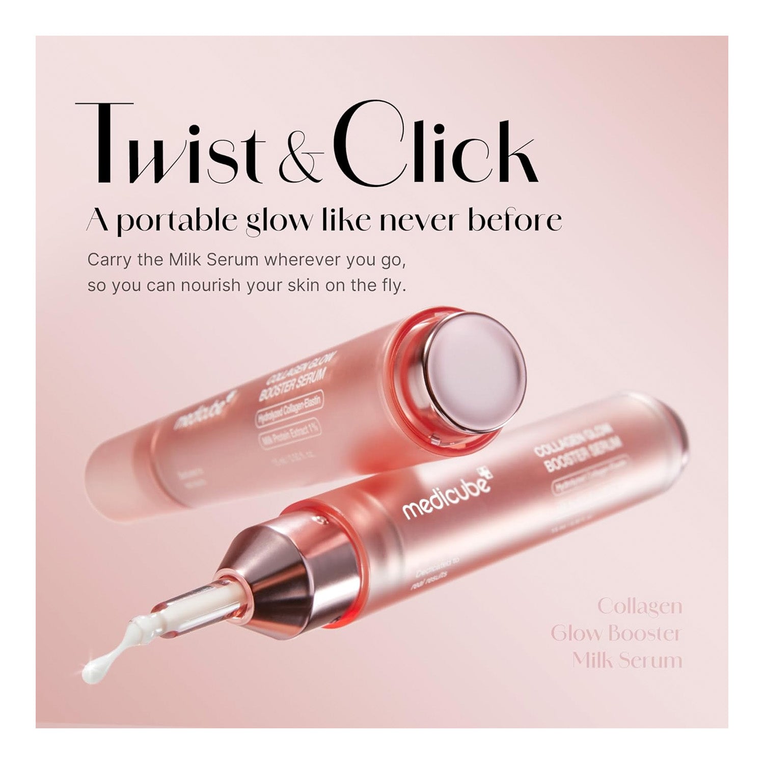 The Medicube Collagen Glow Booster Serum is a luxurious skincare treatment designed to rejuvenate and revitalize the skin. Infused with a potent blend of Niacinamide, Hydrolyzed Collagen, Milk Protein Extract, and Ceramide NP, this serum deeply hydrates, enhances elasticity, and imparts a radiant glow. Its innovative twist-and-click airless packaging ensures precise dispensing and maintains the serum's freshness. With consistent use, it helps to smooth fine lines, even out skin tone, and restore a youthful complexion.