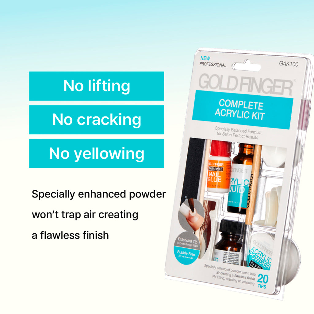 Gold Finger Complete Acrylic Kit is a complete set with everything you need to create salon quality nails. Set contains nail glue for sturdy application, acrylic primer to prepare the nail bed, high-quality bubble-free acrylic liquid and powder, natural nail tips for extensions, and various other accessories like nail forms, a sculpting brush, nail file, buff block, manicure stick, and dappen dish for precise nail application and sculpting.