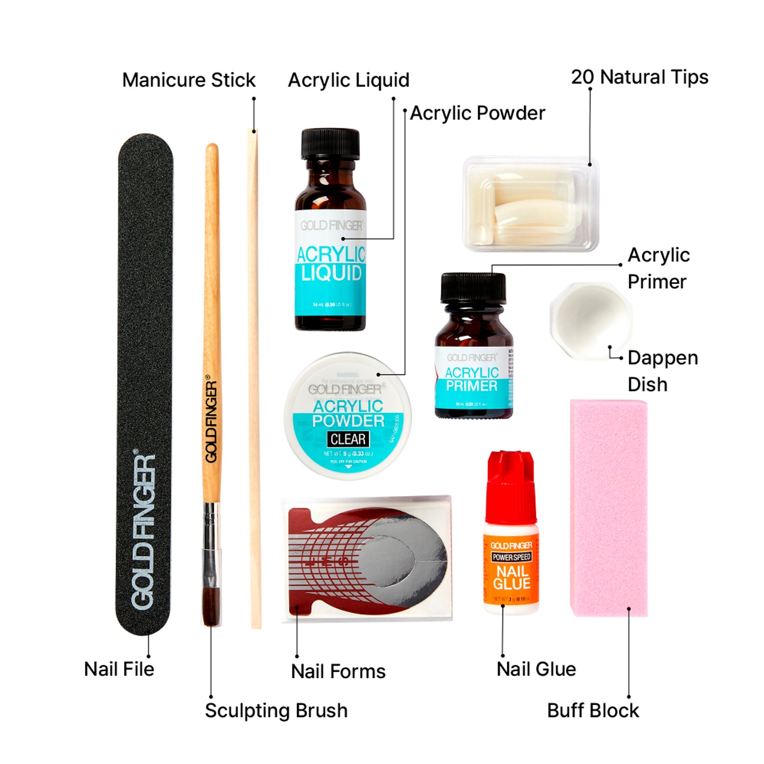 - Kit Contents: 20 Natural Tips, Acrylic Primer, Acrylic Liquid, Acrylic Powder, Nail Glue, Sculpting Brush, Nail File, Buff Block, Manicure Stick, Dappen Dish, Nail Forms