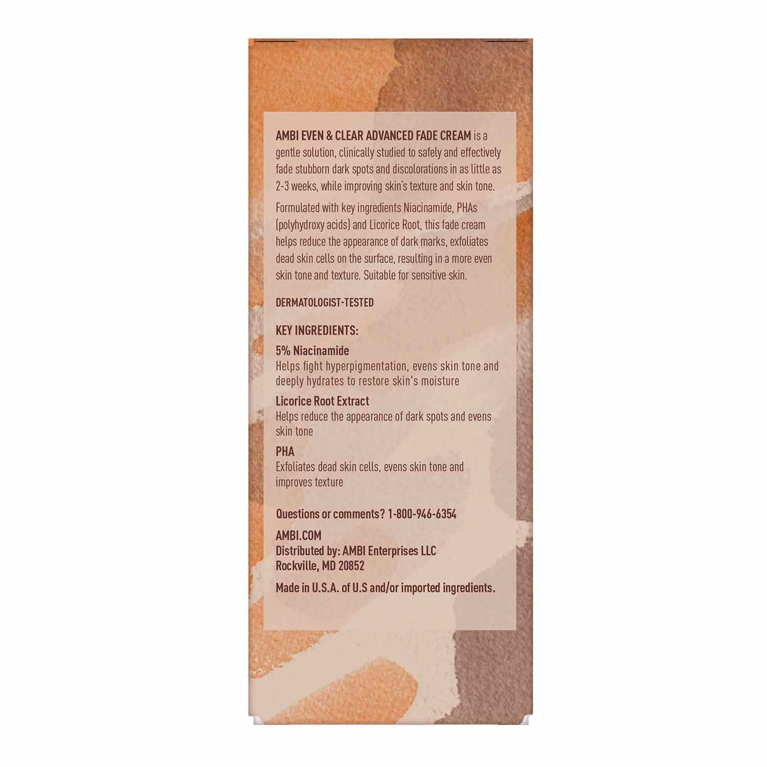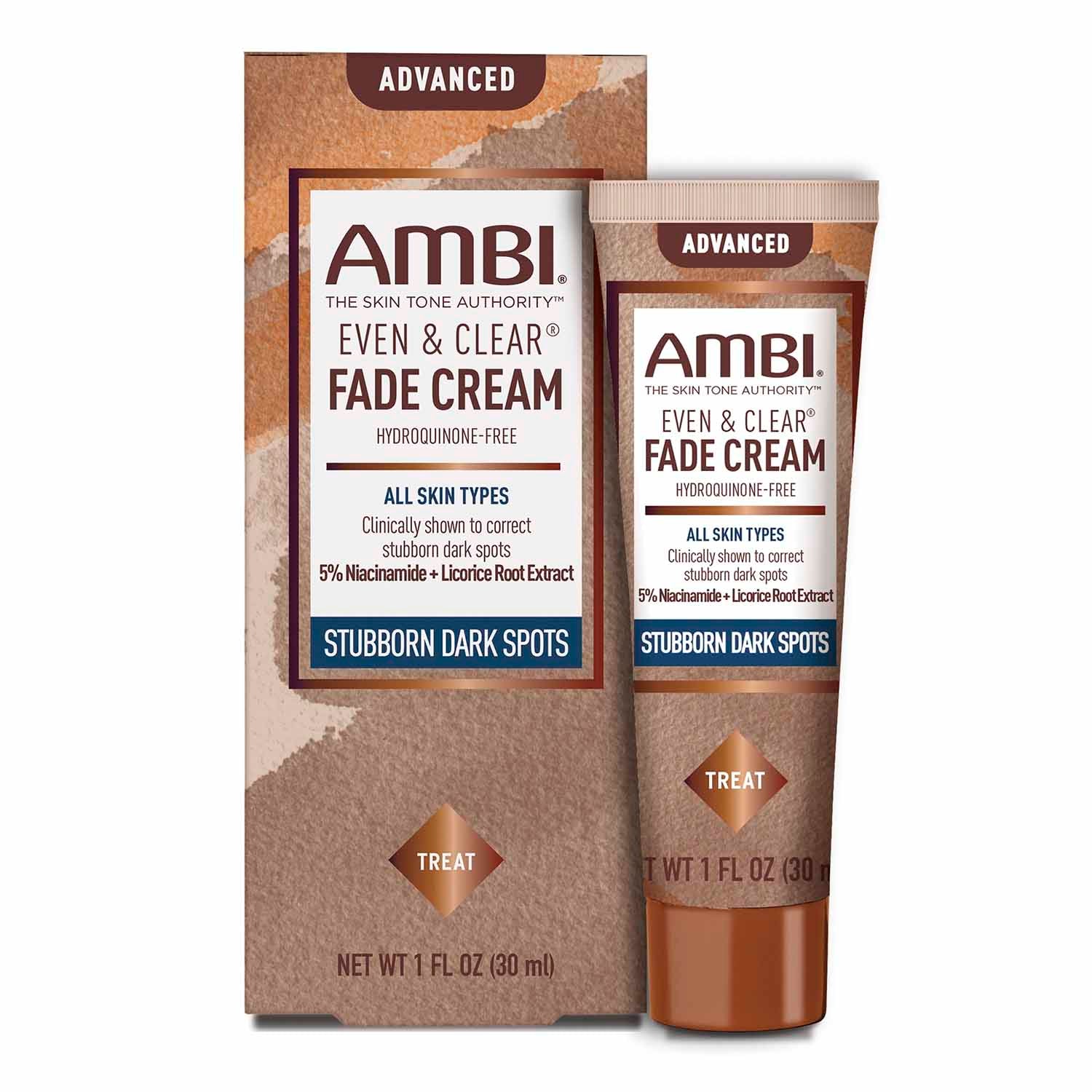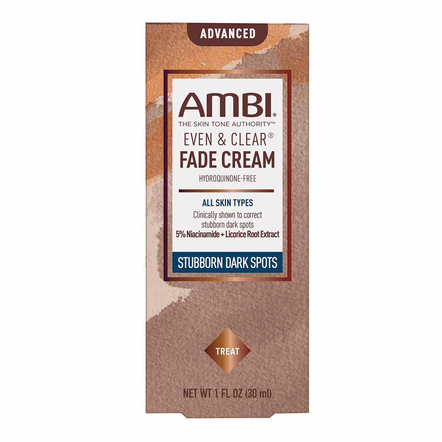 AMBI® EVEN & CLEAR ADVANCED FADE CREAM is a gentle solution, clinically studied to safely and effectively fade stubborn dark spots and discolorations in as little as 2-3 weeks, while improving skin’s texture and skin tone.
