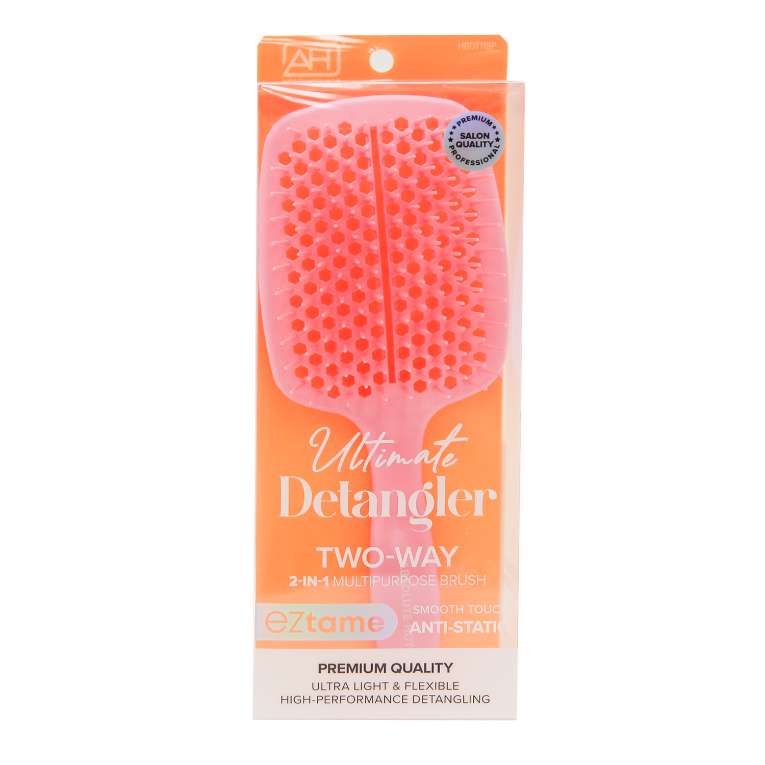 Absolute Hot's Ultimate Two-Way Detangler effectively unravels knots and tangles with minimal pain and effort. The double-sided design with two different length bristles makes this brush the perfect multipurpose tool for all your hair brushing without painfully ripping or tugging at your scalp. Perfect to use on all hair types, wet or dry. reduce styling time and say good bye to painful detangling.