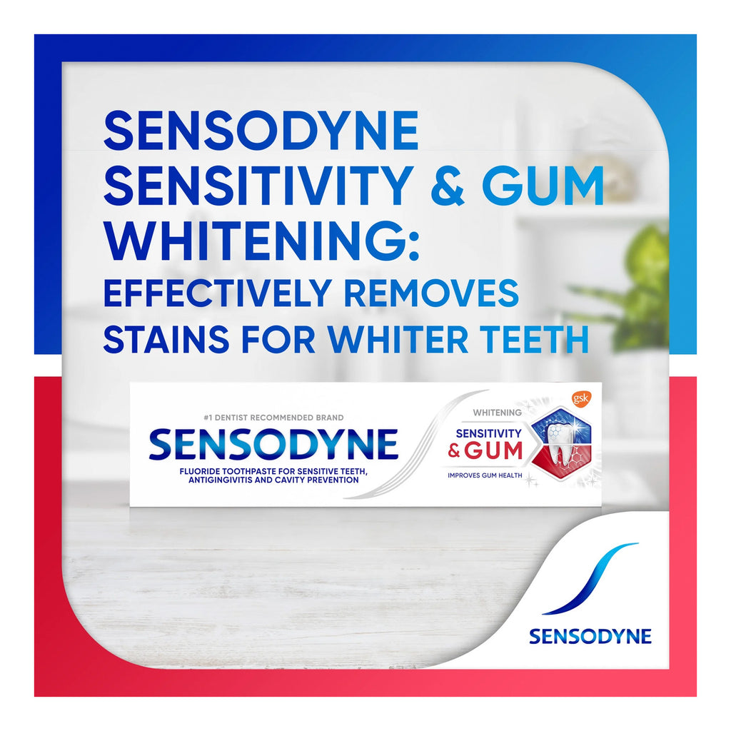 Sensodyne Sensitivity & Gum Whitening Toothpaste (3.4 oz) is a dual-action toothpaste specifically formulated for individuals experiencing both tooth sensitivity and gum issues. Its low-abrasion formula combines stannous fluoride to build a protective layer over sensitive areas with antimicrobial agents that target and remove plaque bacteria associated with gingivitis. Additionally, it gently lifts stains to whiten teeth over time, providing comprehensive oral care with regular use.ย