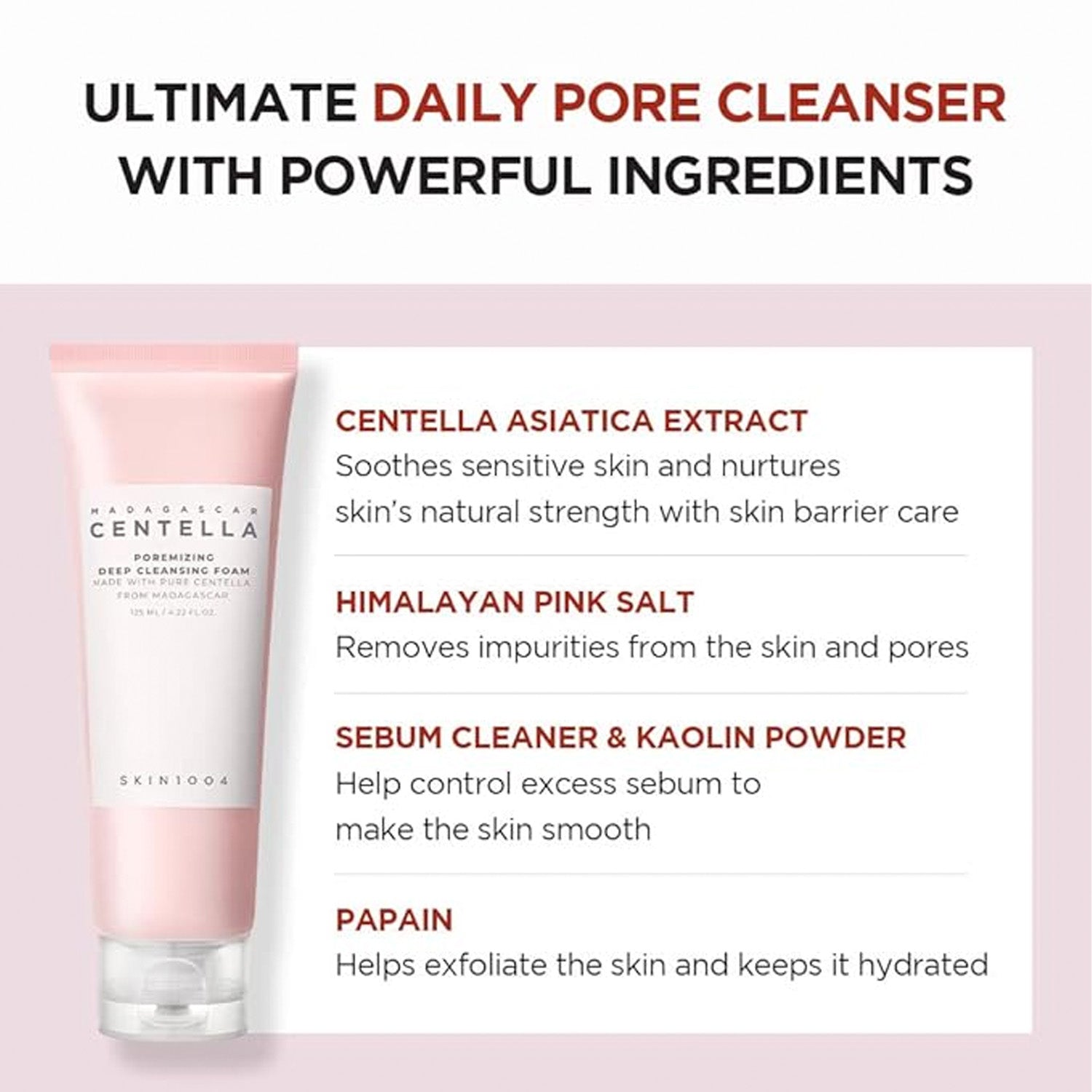 Skin1004 Madagascar Centella Poremizing Deep Cleansing Foam is a rich, creamy facial cleanser designed to deeply cleanse pores while soothing and revitalizing the skin. It uses a unique paste-like formulation that transforms into a dense foam upon contact with water, effectively removing sebum, sunscreen residue, and impurities without stripping the skin. Enriched with Himalayan pink salt and kaolin, it works like a magnet to absorb oil and draw out debris from pores. Gentle exfoliating agents like papaya-derived papain help eliminate dead skin cells, contributing to a smoother texture and refined pores.
