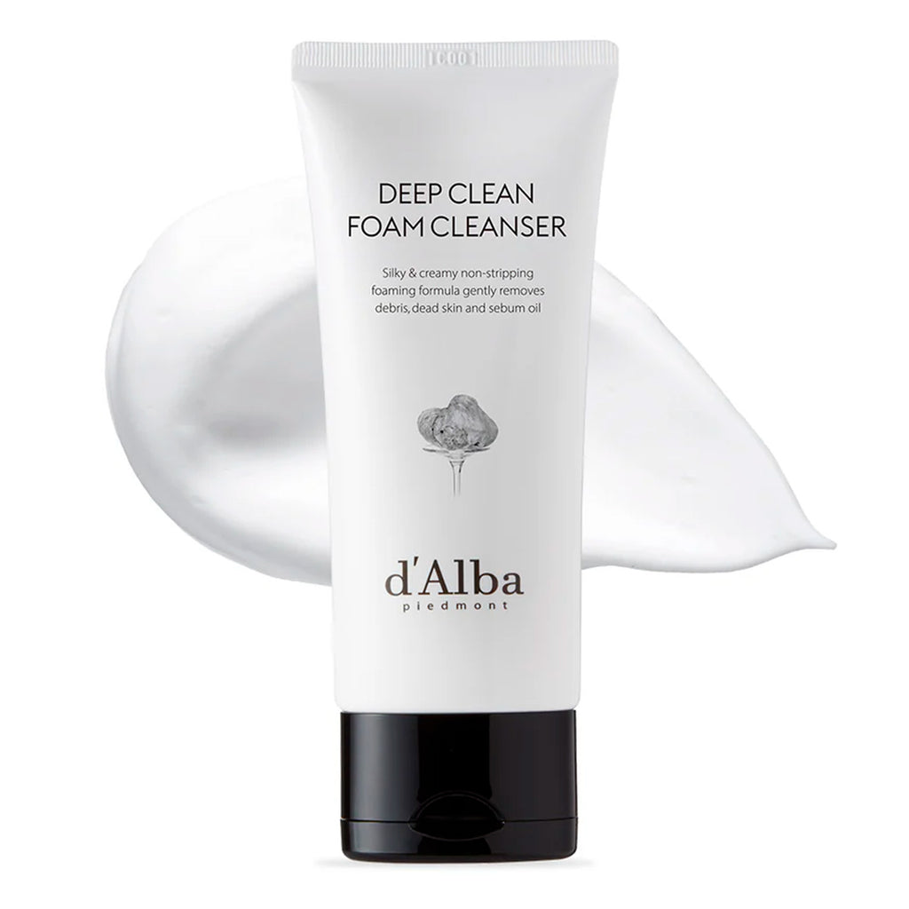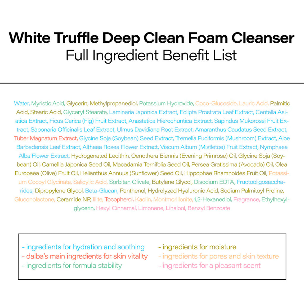 The d'Alba White Truffle Deep Clean Foam Cleanser is a luxurious, vegan-certified facial cleanser that combines the benefits of premium Italian white truffles with advanced skincare technology. Infused with Trufferol™—a proprietary blend of white truffle extract and tocopherol (vitamin E)—this cleanser delivers antioxidant-rich nourishment to the skin. Its 100% plant-based coconut surfactants create a rich, velvety foam that effectively removes impurities, excess oil, and makeup without stripping the skin's natural moisture. Formulated with vegan ceramide NP and hydrolyzed hyaluronic acid, it provides deep hydration, while kaolin and salicylic acid help refine pores and improve skin texture. Panthenol and aloe extracts soothe and calm the skin, making it suitable for all skin types, including sensitive skin.